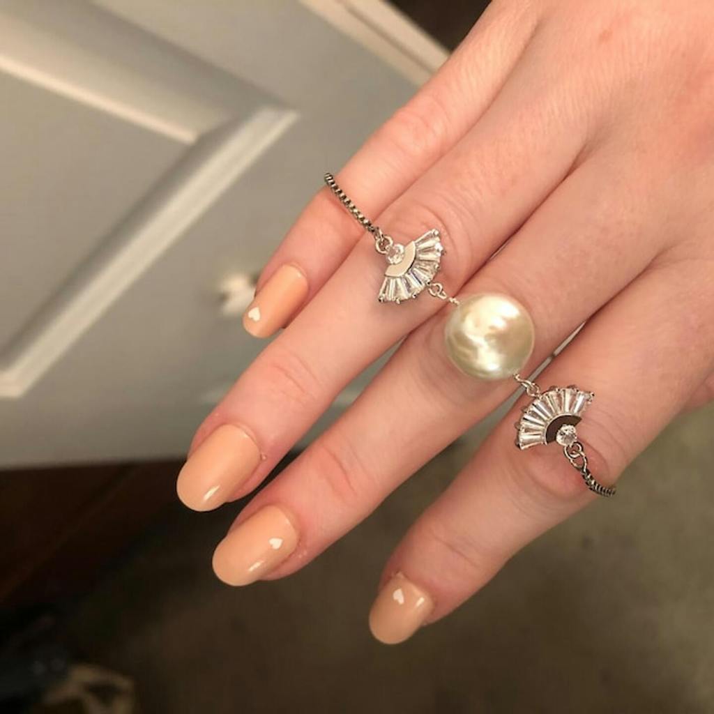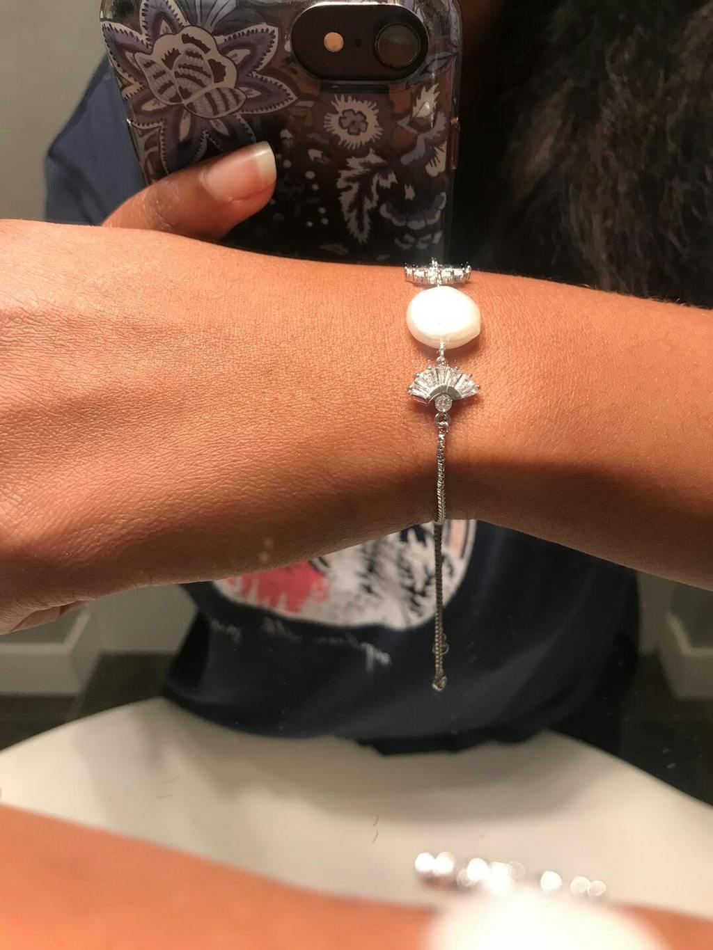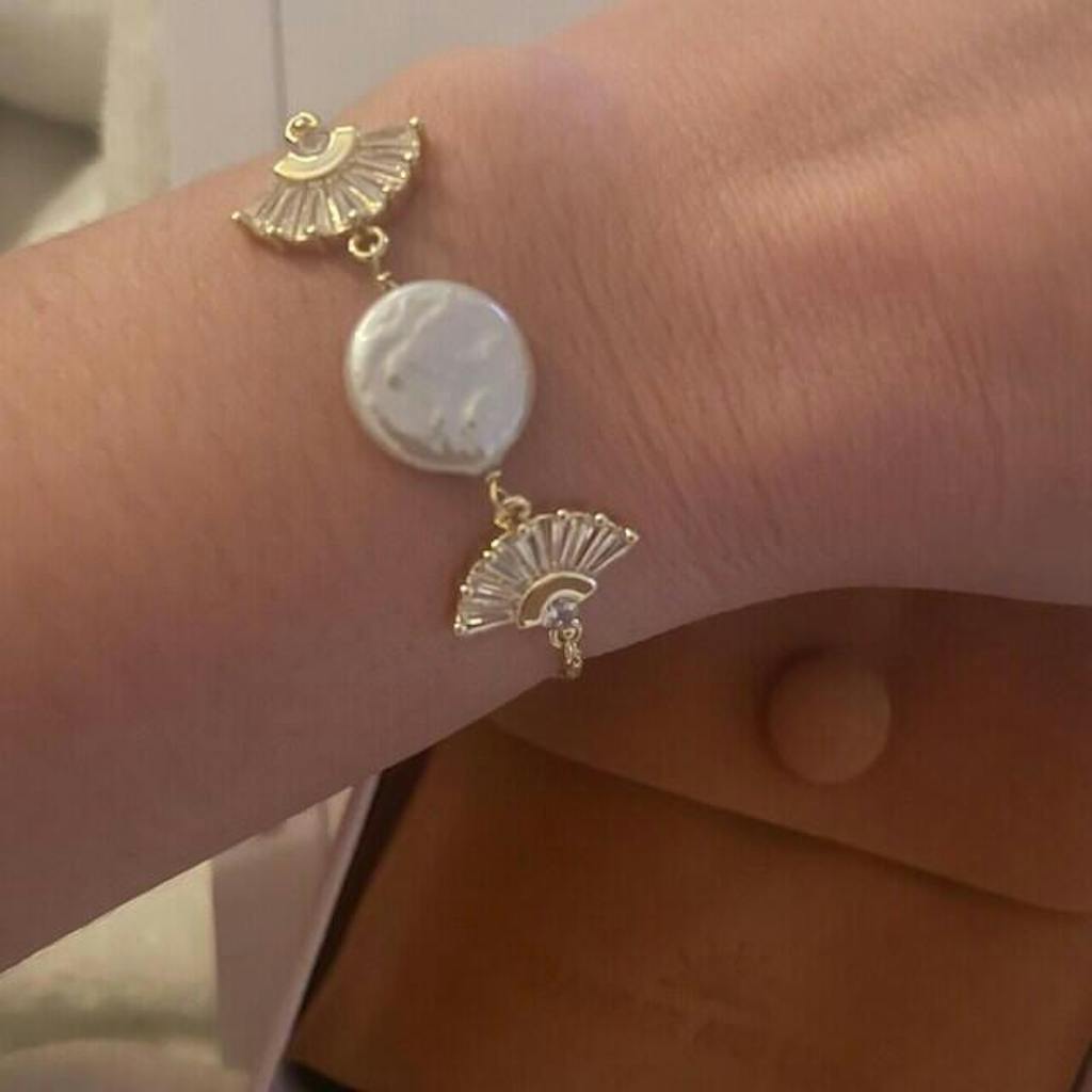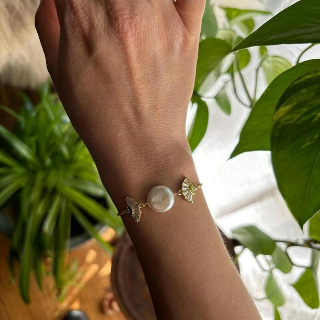 Dieses atemberaubende Armband verfügt über eine flache Süßwasserperle und Fächerakzente im Art-Deco-Stil an einer verstellbaren Kette und verbindet Schlichtheit mit Eleganz. Es ist vielseitig genug für jeden Anlass, von der Veredelung Ihres Alltagslooks bis zur Vervollständigung Ihres Hochzeitsensembles.
